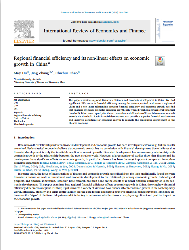 张晶教授作为通讯作者撰写的论文Regional financial efficiency and its non-linear effects on economic growth in China在期刊International Review of Economics & Finance发表(2019年第59卷第1期)。该期刊系经济学SSCI二区期刊,近5年影响因子为1.717,属我校A1类期刊。