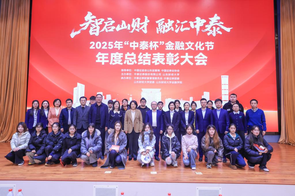 12月30日,2025年“中泰杯”金融文化节年度总结表彰大会在我校章丘校区举行。山东监管局法治处负责人邵烈娜,中泰证券党委委员、首席财富官胡增永,副校长张红霞出席活动。