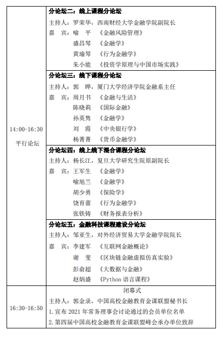 中国高校金融教育金课联盟峰会由中国高校金融教育金课联盟(FCCAFE)发起,旨在深化教育教学改革,建设适应新时代要求的一流课程,创新金融教学模式、教学方法、教学手段,促进金融类专业高层次、高素质、复合型人才的培养,提高教育质量和水平。首届峰会于2019年在北京举行,第二届峰会于2020年在上海举行。