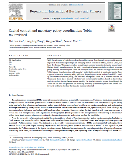 金融学院教师尹智超作为第一作者与彭红枫教授、武汉大学肖卫国教授、肖祖沔副教授合作撰写的论文“Capital Control and Monetary Policy Coordination: Tobin Tax Revisited”在期刊《Research in International Business and Finance》发表(2021年8月)。该期刊系SSCI一区期刊,2020年影响因子为4.09,属我校A1类期刊。