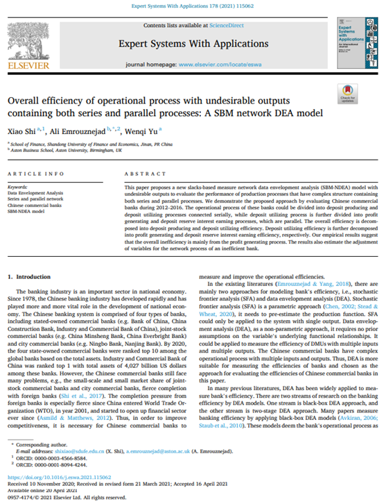 金融学院石晓副教授作为第一作者与英国Aston University的Ali Emrouznejad教授、山东财经大学硕士研究生于汶琦合作的论文“Overall efficiency of operational process with undesirable outputs containing both series and parallel processes: A SBM network DEA model”在期刊《Expert Systems with Applications》发表(2021年9月15日第178卷)。该期刊系运筹学与管理科学SCI一区期刊,2020年影响因子为6.954,属我校特类期刊。