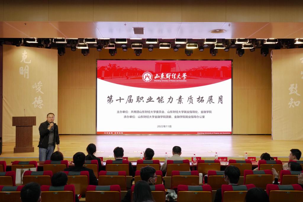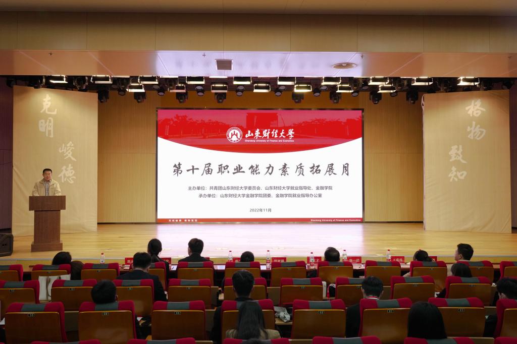 近日,山东财经大学第十届职业能力素质拓展月启动仪式在圣井校区文化活动中心举行。金融学院党委书记吴红文、党委副书记康亚通、团委书记郭夕熙、党委组织员邵珠建、2022级辅导员王蕴玮及部分学生代表参加启动仪式。活动由金融学院就业办主任徐洁主持。