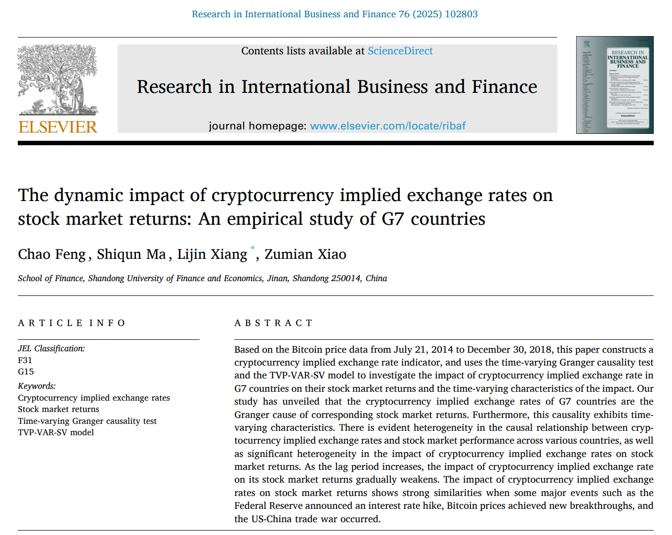 金融学院副教授向丽锦作为通讯作者与博士生封超、马世群及副教授肖祖沔合作的论文《The dynamic impact of cryptocurrency implied exchange rates on stock market returns: An empirical study of G7 countries》在期刊《Research in International Business and Finance》在线发表(2025年2月)。该期刊为SSCI一区期刊,期刊最新影响因子为6.3,属我校A1类期刊。