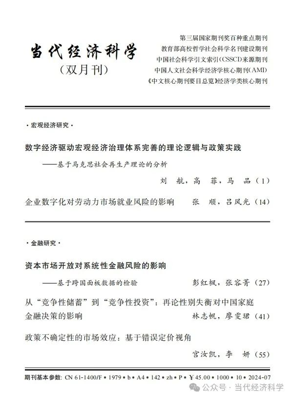 金融学院彭红枫教授与中国海洋大学博士生张容菁合作撰写的论文《资本市场开放对系统性金融风险的影响——基于跨国面板数据的检验》在期刊《当代经济科学》2024年4期发表。该期刊属于我校A2类期刊。