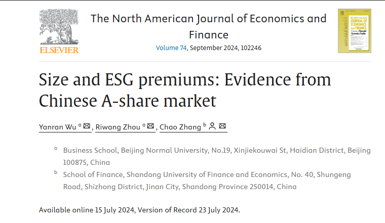 金融学院青年教师张超作为通讯作者与北京师范大学伍燕然教授(第一作者)、周日旺博士(第二作者)合作的论文《Size and ESG premiums: Evidence from Chinese A-share market》在《The North American Journal of Economics and Finance》2024年第74卷(Volume74)发表。该期刊为SSCI一区期刊,期刊最新影响因子为3.8,属我校A1类期刊。https://doi.org/10.1016/j.najef.2024.102246