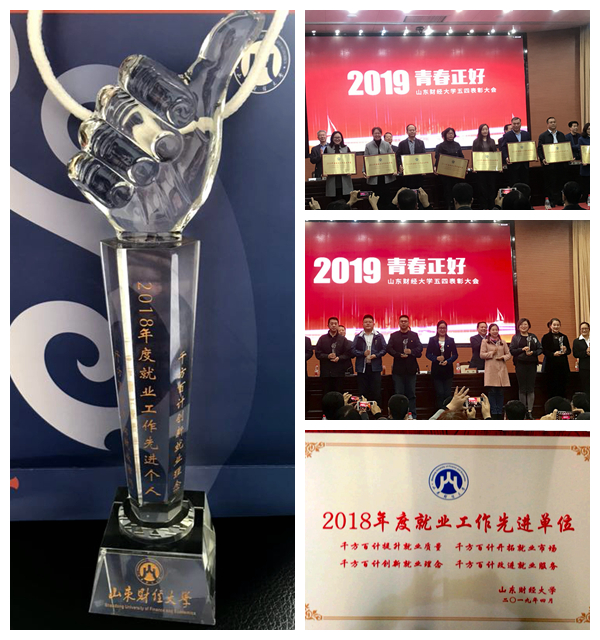 金融学院团委获得2018年度山东财经大学红旗团委、校园文化活动工作创新奖及大学生社团活动工作创新奖,团委书记陈静获得2018年度山东财经大学优秀青年工作者;我院获得2018年度就业工作先进单位,郭夕熙获得2018年度就业工作先进个人;金融学1601班团支部获得山东财经大学十佳团支部荣誉,2016级金融学创新实验班团支部、金融学1606班团支、2018级金融学创新实验班团支部、金融学1705班团支部、金融学1804班团支部、2018级金融学硕研究生团支部获得先进团支部荣誉;我院学生王文浩、于文昊获得2018年度财大最美青年荣誉,唐梓皓、张倬诚、孙艺菲获得2018年度校园文化活动先进个人;学院陈静等57人获得2018年度山东财经大学优秀共青团干部;学院张瑶等264名团员被评为2018年度山东财经大学优秀共青团员。