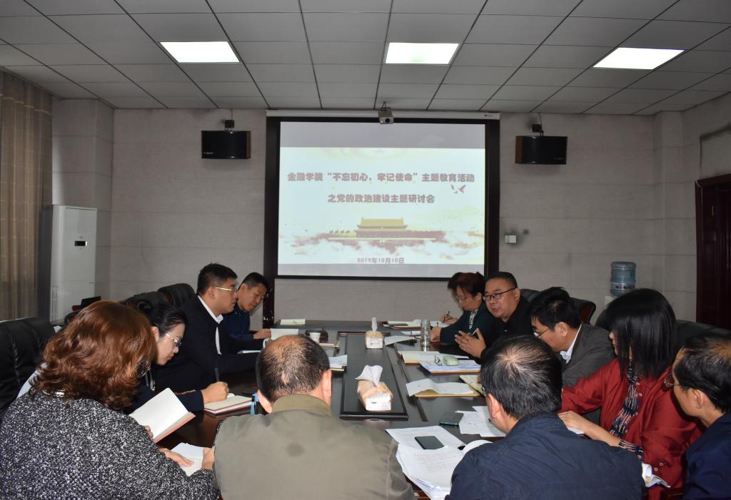(通讯员:邵珠建)10月10日上午,金融学院在舜耕校区召开“不忘初心,牢记使命”主题教育之党的政治建设主题研讨会。学校指导督查组成员,教师工作部部长刘旻航、校纪委办公室主任高磊,学院全体领导班子及部分支部书记、教师党员与会。
