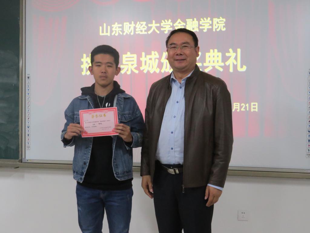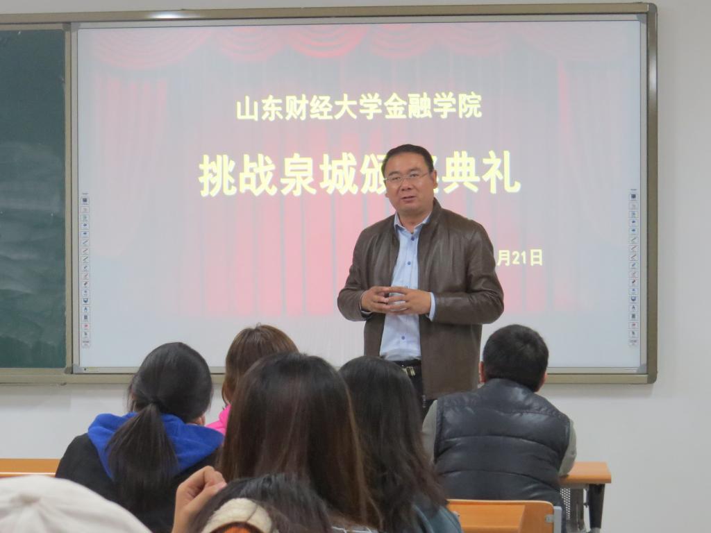 (通讯员:常誉)11月21日下午,山东财经大学金融学院在圣井校区举办“挑战泉城”活动颁奖仪式。本届“挑战泉城”活动吸引了来自14个学院,119支团队,470余人参加,经过紧张角逐,6支团队脱颖而出获得大赛奖励。金融学院党委书记吴红文,团委书记陈静,学工办主任、辅导员孙琦,辅导员徐洁、邵珠建及“挑战泉城”优秀团队参加颁奖。