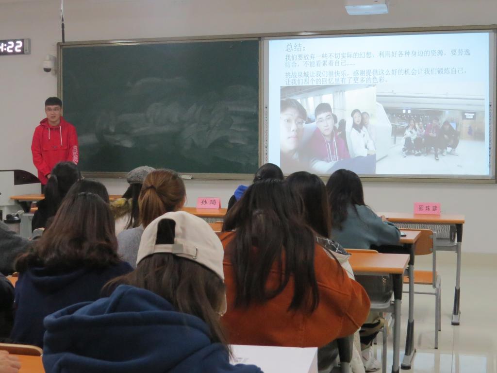 金融学院学生代表对“挑战泉城”系列活动进行总结,他主要阐明了实践的重要意义,呼吁大家要按照学院要求积极参加各类实践科创活动,提升学生的实践能力与团队协作沟通能力。随后,“挑战泉城”优秀团队逐一进行了汇报。获奖六支队伍通过播放视频,幻灯片等方式进行了活动成果展示,分享了活动中的趣事及感悟,对团队的表现做出总结。