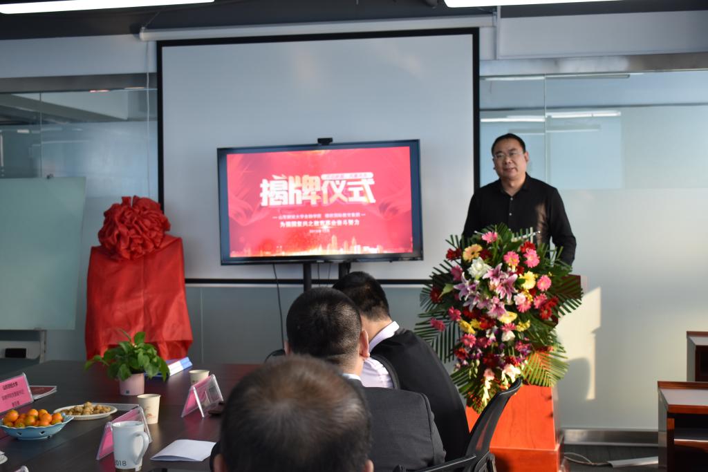 金融学院“创新创业指导教师”、德欧国际教育协会会长李万强在致辞中对我院来访表示热烈欢迎,对行业及公司发展情况做了介绍,表示将以社会实践基地建设为依托加强与山财大的联系,互利共赢,努力肩负起企业的社会责任,为学生提供更好的实践条件。吴红文书记简要介绍了学校及学院学科发展、科研工作、人才培养等工作发展情况,希望双方能够通过实践基地建设架设起沟通的桥梁,不断增进了解和互信,切实发挥实践基地作用,拓宽人才培养路径,不断增强学生实习实践能力,开展高质量合作,把更好服务学生成长发展。