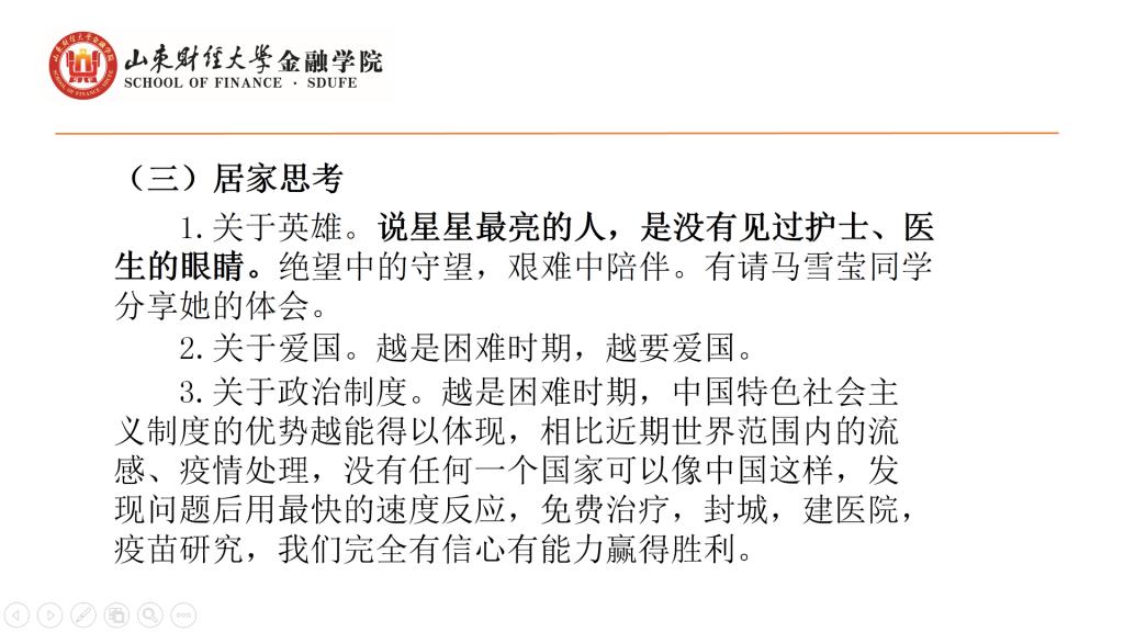 在全国疫情防控最吃劲的关键时期,金融学院集中召开“云班会”,进一步拉近了师生之间的距离,对于传达学校学院关怀,稳定学生情绪,提升线上授课效果,增强学生抗疫必胜信心起到了积极作用,为学院“三全育人”综合改革拓展了新的工作途径。