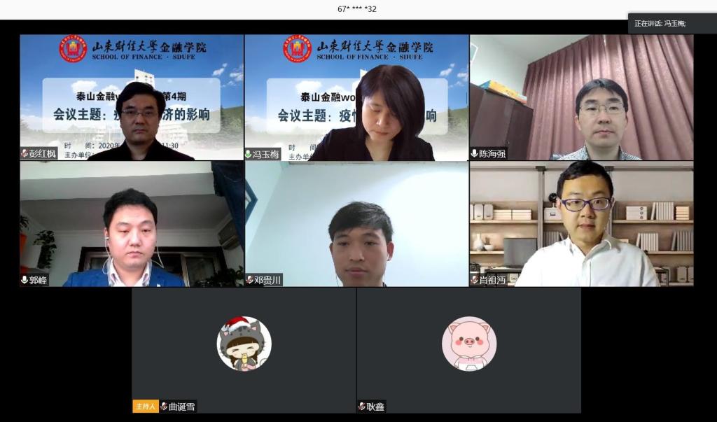 (通讯员:曲诞雪)4月24日上午,由山东财经大学金融学院主办,山东省金融学会秘书处、山东省金融产业优化与区域管理协同创新中心承办的“泰山金融workshop(第4期)”通过腾讯会议客户端成功举行。本期会议邀请厦门大学王亚南经济研究院和经济学院金融系教授、博士生导师陈海强,上海财经大学公共经济与管理学院投资系副教授、北京大学数字金融研究中心特约高级研究员郭峰,中山大学国际金融学院科研博士后邓贵川和山东财经大学金融学院副教授肖祖沔共同就“疫情对经济的影响”这一话题展开研讨。本期会议由金融学院副院长冯玉梅主持,院长彭红枫致辞,学院部分教师和学生通过腾讯会议平台观看了会议直播。
