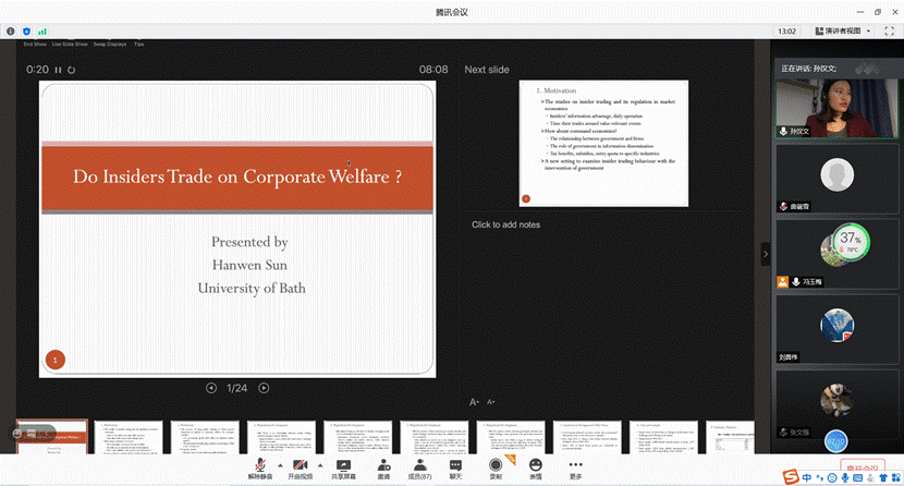 (通讯员 曲诞雪)10月23日下午,由山东财经大学金融学院、山东省金融产业优化与区域管理协同创新中心、山东财经大学金融国际研究中心联合举办的第9期“泰山金融学术训练营”通过腾讯会议举行,英国巴斯大学管理学院孙汉文老师应邀做客本次学术训练营,为师生们带来了题为“Do Insiders Trade on Corporate Welfare?”的讲座,学术训练营由金融学院副院长冯玉梅主持,学院部分教师和研究生参加了本次活动。