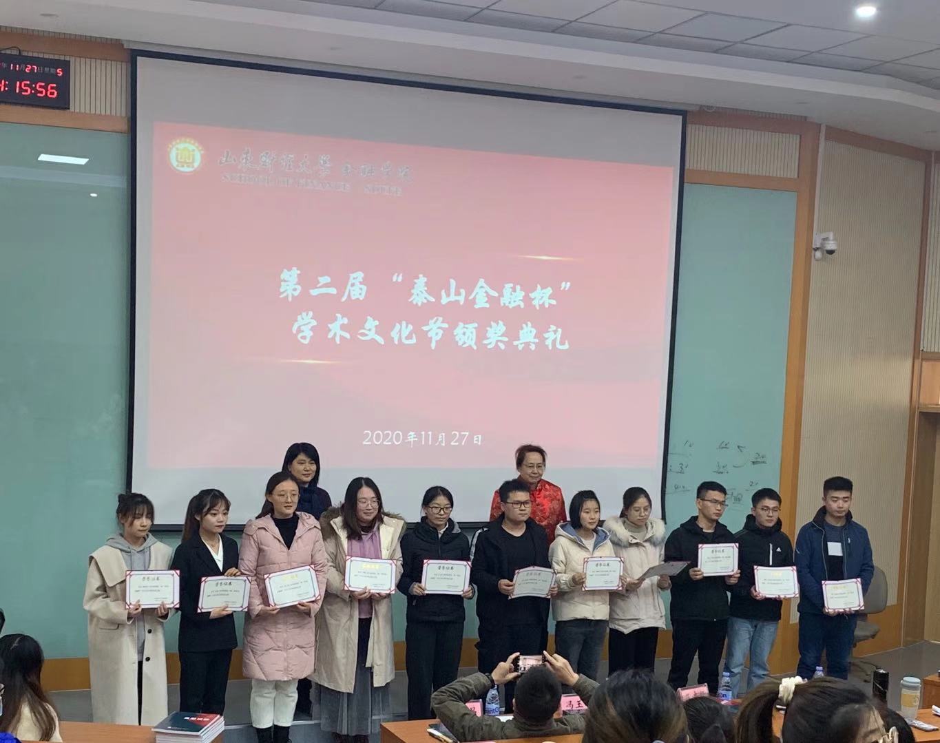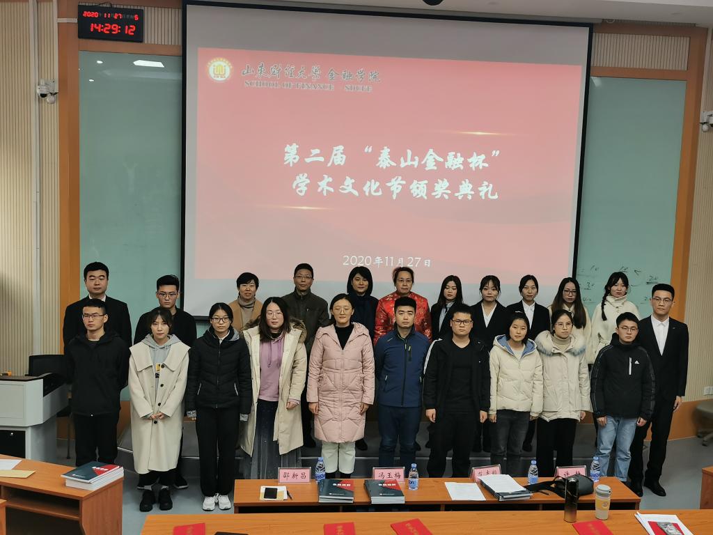 (通讯员:胡芷漩)11月27日下午两点,山东财经大学金融学院第二届“泰山金融杯”学术文化节颁奖典礼在第三阶梯教室如期举行。金融学院党委副书记范志毅,副院长冯玉梅,研究生辅导员许静、邵新昌以及全体第九届研究生会代表、2020级新生代表参加了此次颁奖典礼。颁奖典礼由范志毅主持。
