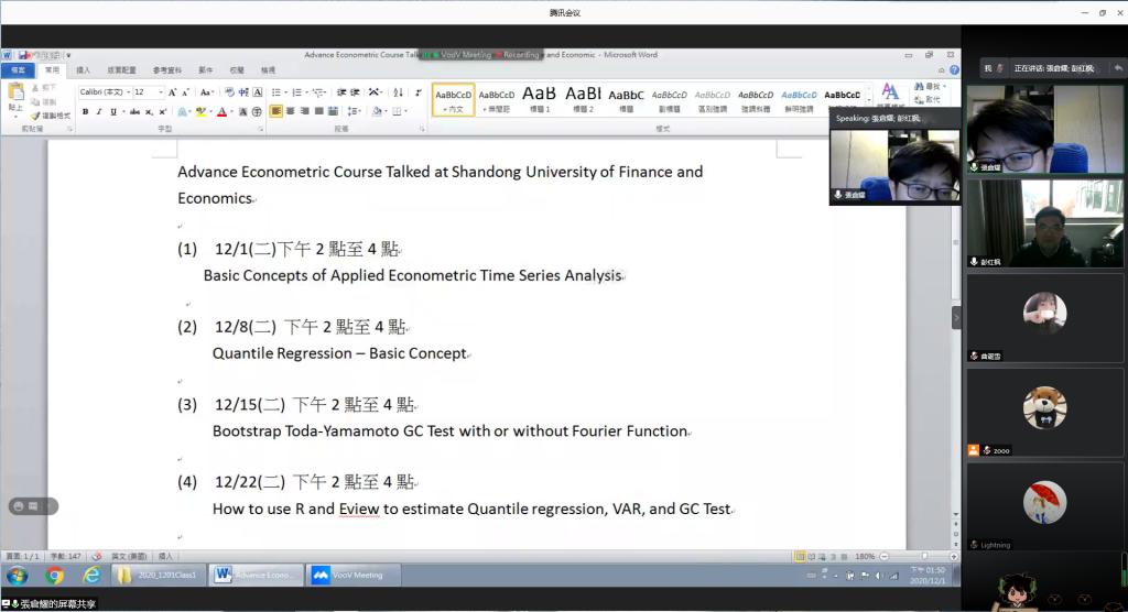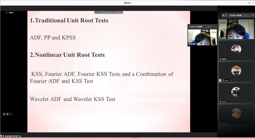 (通讯员:肖祖沔、曲诞雪)12月1日下午,由山东财经大学金融学院、山东省金融产业优化与区域管理协同创新中心、山东财经大学金融国际研究中心联合举办的第12期“泰山金融学术训练营”通过腾讯会议举行,中国台湾逢甲大学财务金融学系特聘教授张仓耀老师应邀做客本次学术训练营,为师生们带来了题为“Basic Concepts of Applied Econometric Time Series Analysis”的讲座,学术训练营由国际金融系主任肖祖沔主持,彭红枫院长、学院部分教师和研究生参加了本次活动。