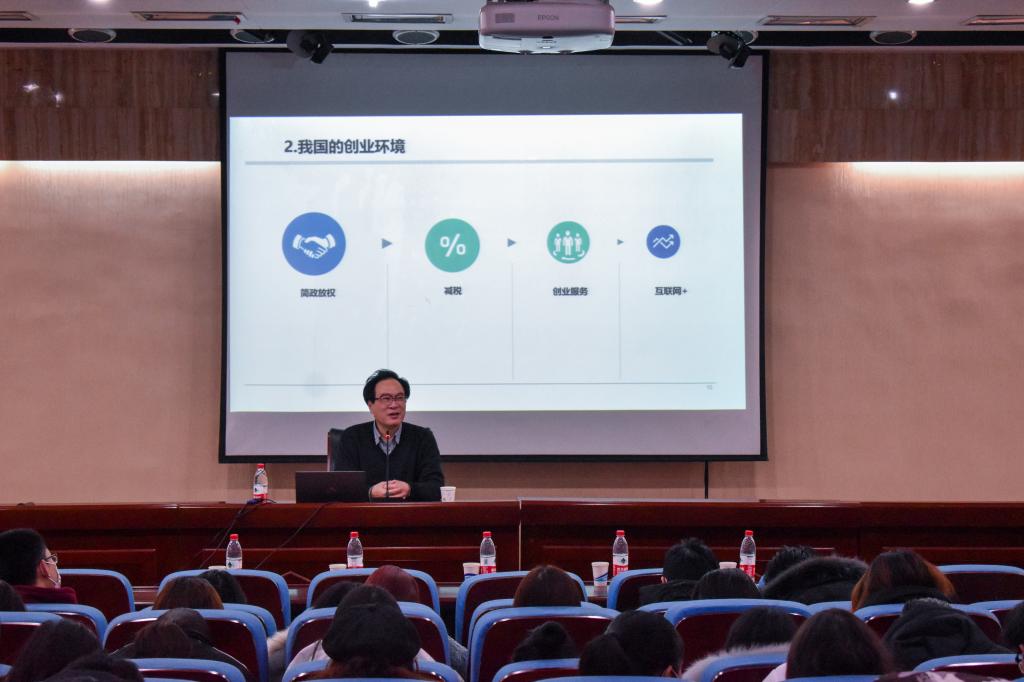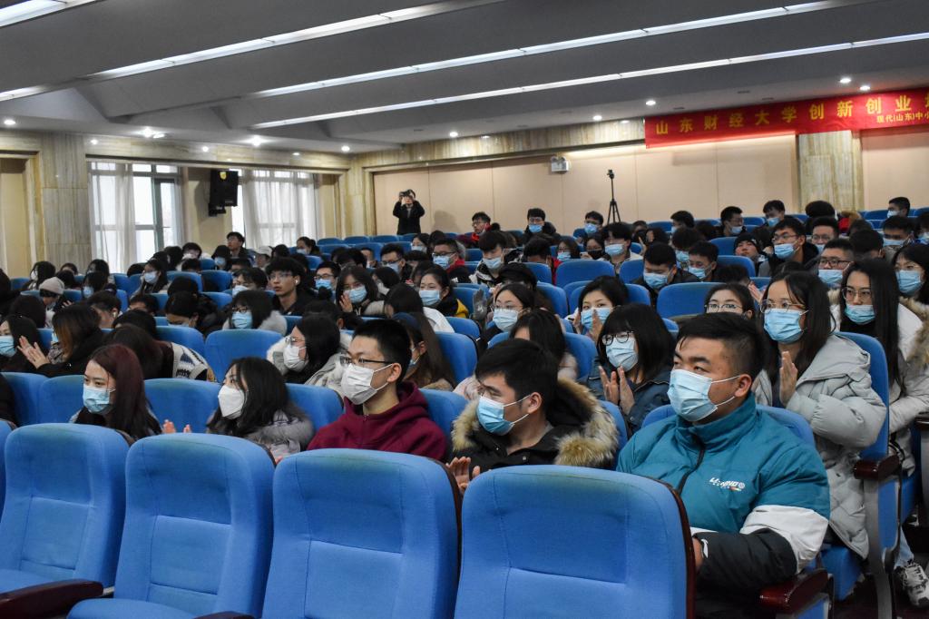 窦副局长从国家对创业的总体部署和大力开展双创工作两方面进行深入介绍。首先,他为大家介绍了创业的含义和主体,并指出创业是财富之源,窦副局长又结合国内外形势与背景及自己的实际生活经历向大家简要说明了我国四次创业大潮,同时围绕简化政权、减税、创业服务及“互联网+”四个关键点阐述了我国的宏观创业环境并结合我国现代化发展进程与相关政策进行具体分析。随后,窦副局长为大家展示了我国大学生创业情况与国家发布的关于大学生创业的政策。他指出,同学们仅仅具有创业意识是不够的,还应熟悉创业政策,为增强自身创业能力夯实基础。随后,窦副局长从济南市的创业优势、创业建设和全程创业服务三个方面向大家介绍大力开展双创工作的内容,他提到济南市具有交通便利、资源丰富、发展强劲和环境优越的四大创业优势,详细介绍了济南的创业建设,也为大家解释了全程创业服务的相关内容。最后,他希望大家毕业后留在济南参与创业建设,也表示济南市将为广大同学创业提供一切政策支持和服务。