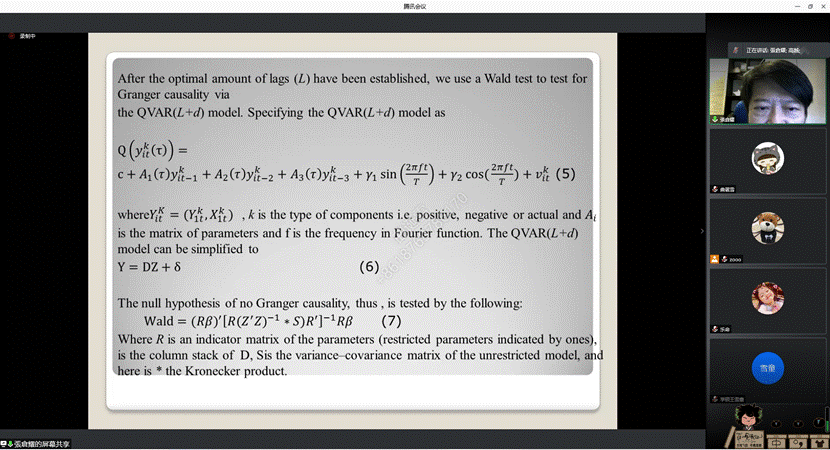 本次讲座张教授先回顾了之前讲授的Quantile VAR模型相关内容,然后进入了Quantile on Quantile模型的讲解。区别于经典的Quantile Regression,Quantile on Quantile模型能够更好地识别时间序列之间不同分位的非对称性影响,因而应用广泛。在理论介绍基础上,张教授选取了不同的例子,演示了相关代码,以及有无控制变量情形下模型的估计过程。