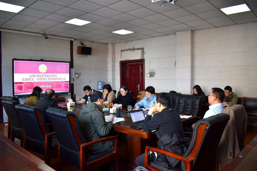 (通讯员 邵珠建)为进一步推进“三全育人”工作,全面提升改革示范建设水平,3月12日上午,金融学院于舜耕校区第三会议室组织召开“三全育人”工作阶段性汇报暨提升座谈会。金融学院领导班子成员、院办公室、学工办(团委)参加了会议。会议由党委书记吴红文主持。