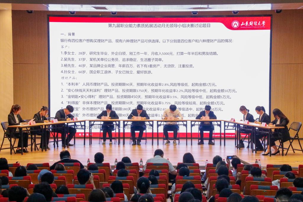 6月10日晚,金融学院于圣井校区文化活动中心报告厅举办第九届职业能力素质拓展月系列活动之无领导小组讨论决赛。金融学院党委书记吴红文、学校就业指导处副处长杜丽娜、管理科学与工程学院党委副书记朱翠珍、学院党委副书记范志毅、研究生导师柏宝春,山东经纬信息咨询有限公司总经理李洪升,中公教育资深研究与辅导专家赵有志等参加本次活动。金融学院就业办主任郭夕熙主持本次比赛。