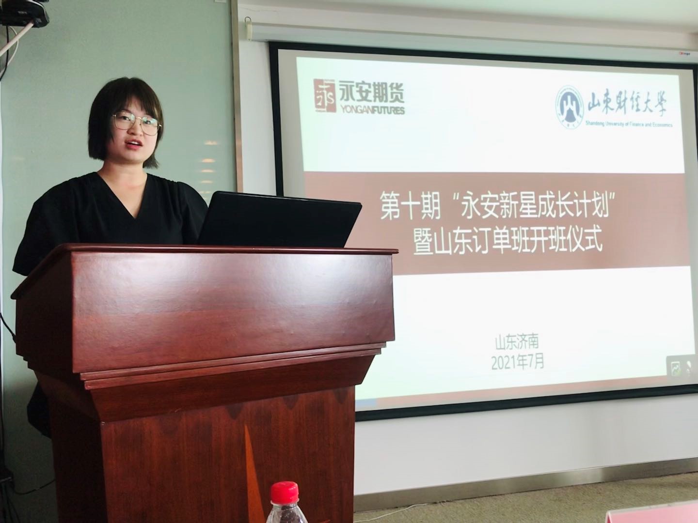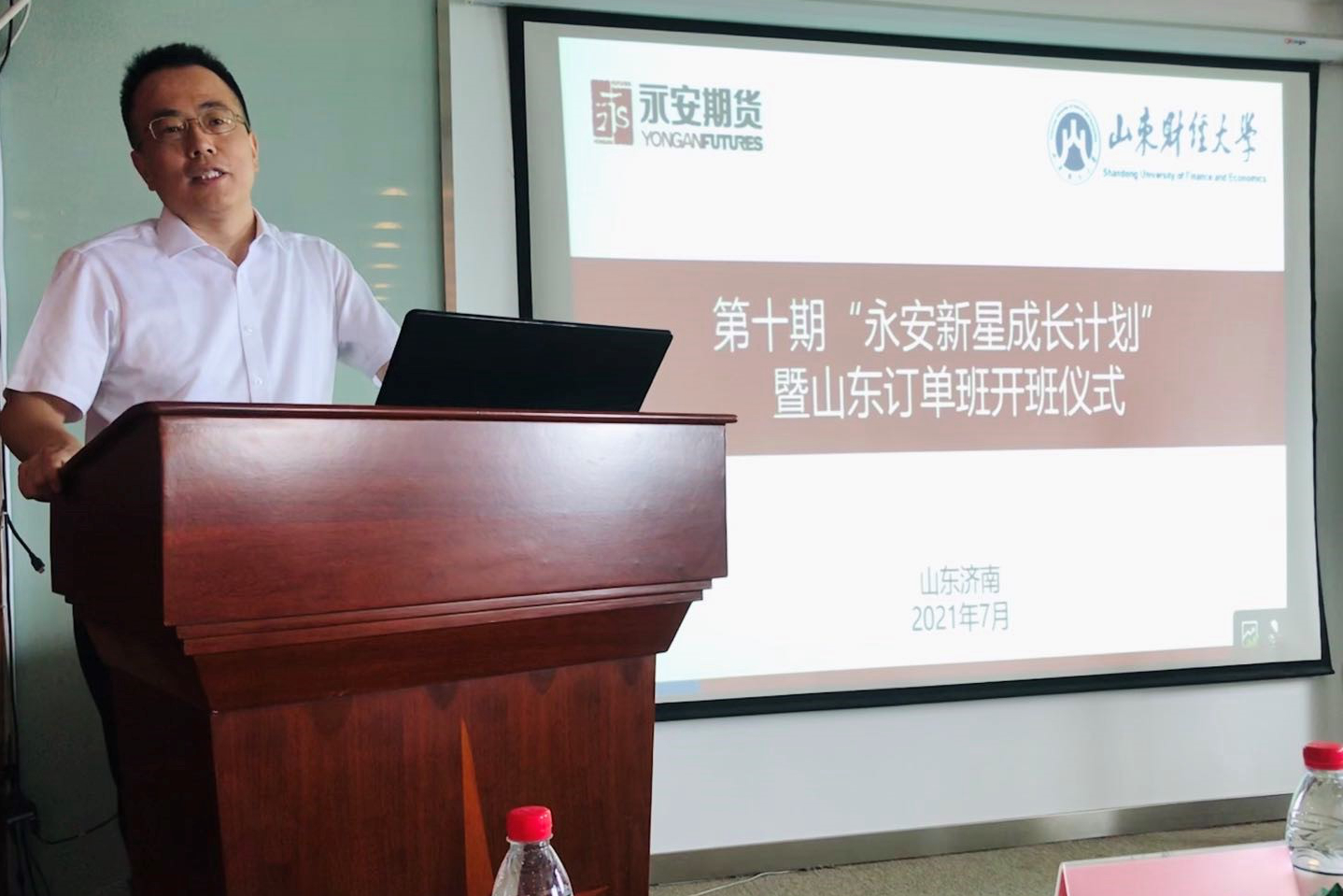 吴红文介绍了学院目前的发展现状和人才培养情况,他希望同学们珍惜学习机会,遵守学习纪律,做好个人疫情期间的防护,保障身体健康,他期望同学们充分利用暑假时间,深耕行业前沿,增长专业知识,祝愿同学们学业有成。永安期货山东分公司总经理李庆国简要介绍了中国期货行业发展变化和永安期货的发展概况,培训班对于期货行业的人才储备和发展具有重要意义,他希望学员们加强沟通交流,掌握期货知识和技能,为期货行业的发展做出贡献。金融学院校友、往期订单班学员代表刘夏颖发言,她分享了在永安期货订单班的学习收获和心路历程,永安期货完善畅通的培训机制和人才晋升渠道给予她很多机会和挑战,她鼓励同学们扎实刻苦学习专业知识,争取在职场中崭露头角。随后,卡内基训练济南公司总经理郑公霞给同学们上了第一堂题为《未来职场必备的核心竞争力》的职业规划课程,为期三周的培训课程正式展开。