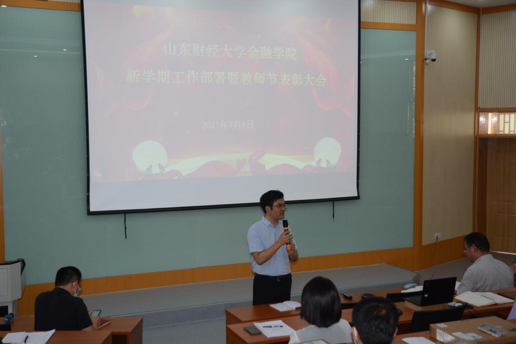 9月9日下午,在我国第37个教师节来临之日,金融学院在舜耕校区第三阶梯教室召开了新学期工作部署及教师节表彰大会。根据学校防疫要求,会议采取了线上线下相结合方式进行,学院领导和部分教师代表参加现场会议。会议由学院党委副书记康亚通主持。