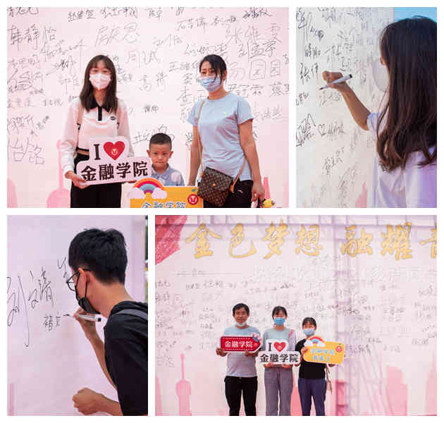 完成报到后,新生携家长走近签名墙,郑重地签下大学“第一笔”,尽显学子的壮志与抱负。迎新志愿者端起相机,捕捉帧帧美好镜头,记录中青两代共续财大之缘的精彩瞬间。报到新生中有与父母均是校友的、有报到当日即生日的、有带着社区防疫志愿者表扬信来的……迎新现场惊喜连连。“金色梦想,融耀青春”,金融学院莘莘学子在此开启辉煌之旅。
