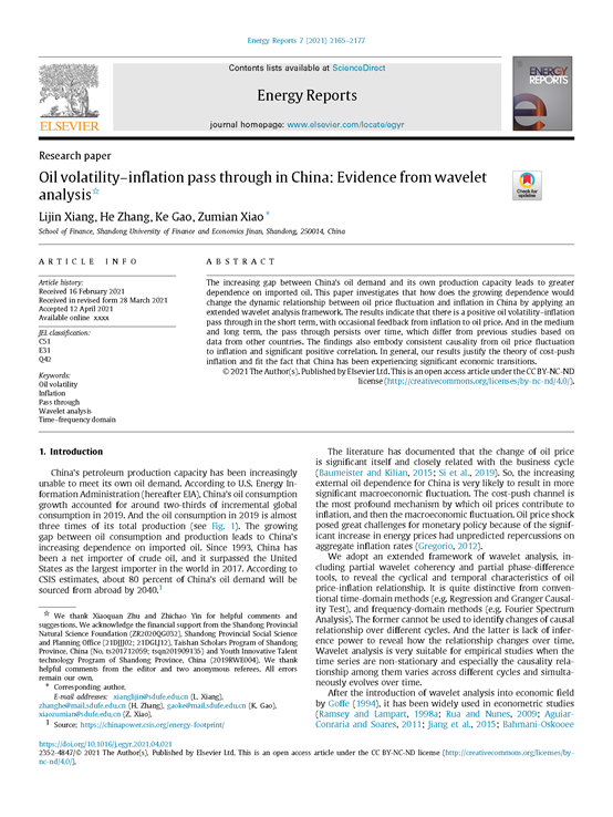 金融学院向丽锦副教授作为第一作者撰写的论文“Oil volatility-inflation pass through in China: Evidence from wavelet analysis”在期刊《Energy Reports》发表(2021年第7卷)。该期刊系能源领域SCI一区期刊,2020年影响因子为6.87,属我校A1类期刊。