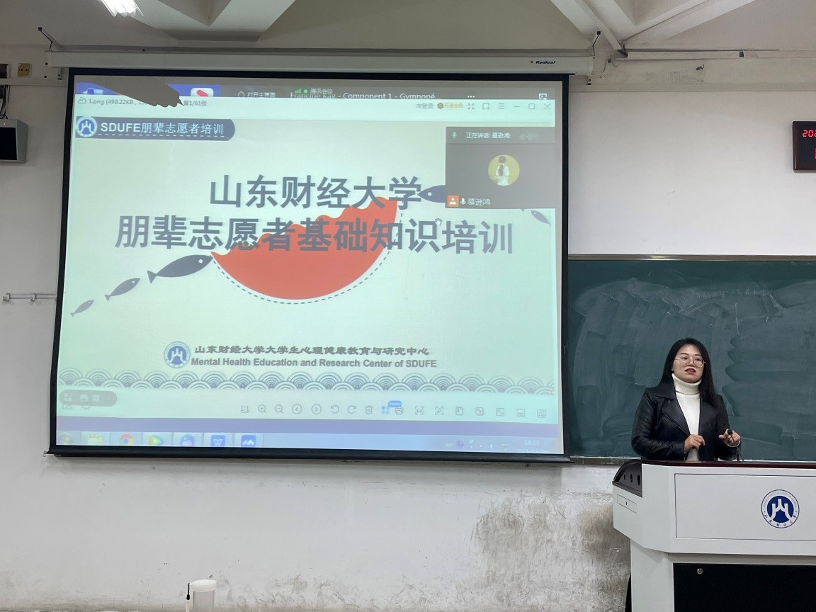 (通讯员 张泽华)为普及心理健康知识,促进校园朋辈互助,11月26日下午金融学院于舜耕校区6116教室举办了朋辈志愿者培训讲座。讲座由辅导员徐洁老师主讲,研究生新生朋辈志愿者及心理委员参加线下培训,其余同学线上参与。