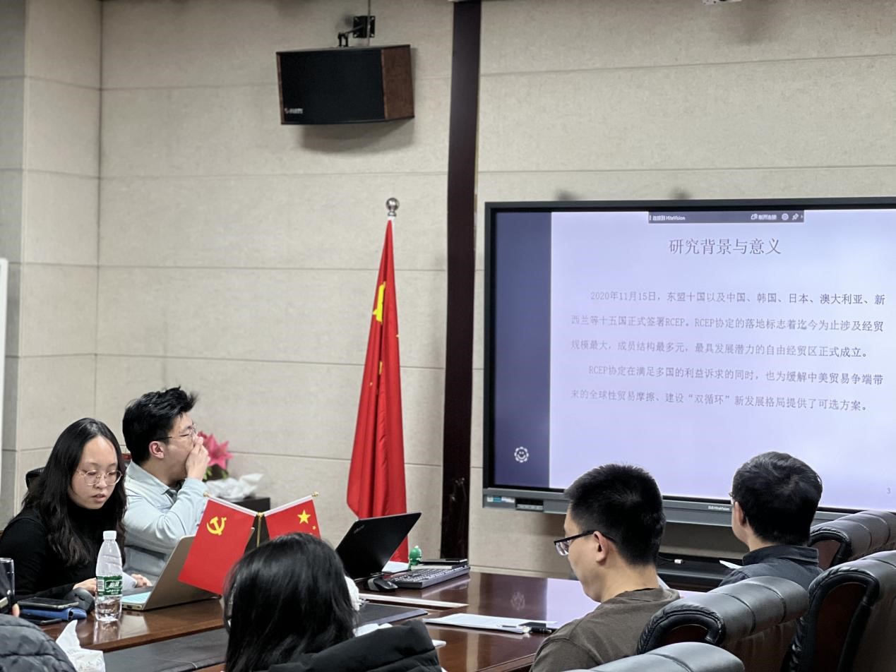 常晓君博士继续围绕RCEP进行汇报,论文题目是《RCEP贸易网络结构特征及影响因素研究》,文章对RCEP成员国贸易数据进行网络整体特征与结构特征分析,刻画区内成员国贸易网络关系进行评价,并利用随机指数模型对RCEP协定签署后的网络特征进行展望。点评老师围绕样本选择、参考文献的选择、指标体系构建与边际贡献的挖掘等提出问题与建议。