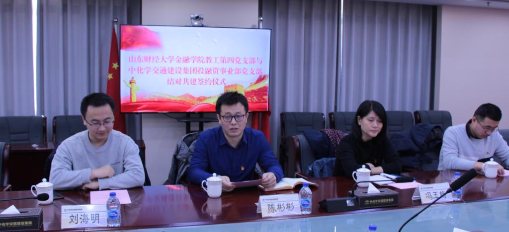 会上,陈彬彬介绍了山东财经大学及金融学院的发展历程与未来规划,并对支部共建的工作目标以及形式做了简单介绍,希望双方能以制度为抓手,落实党建合作方案,以交流为目的,丰富党建活动内容,不断增强共建实效性。陈彬彬指出,在中国共产党成立100周年之际开展此次共建活动意义重大,有利于双方党支部通过学习交流、结对帮扶、业务互助等形式,互通有无,优势互补,资源共享,为彼此党建工作注入新的活力,促进校企双赢,共同发展。
