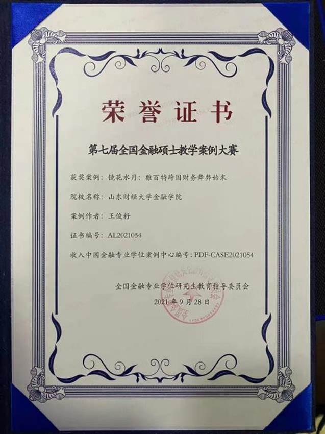 近日,全国金融专业学位研究生教育指导委员会(简称金融专业学位教指委)公布了第七届全国金融硕士教学案例评选结果,我院王俊籽教授提交的案例《镜花水月:雅百特跨国财务舞弊始末》在专家评审中脱颖而出,获评全国优秀金融硕士教学案例。
