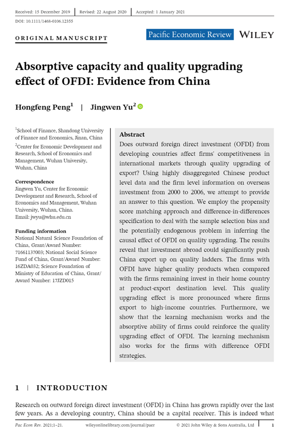 金融学院彭红枫教授作为第一作者与武汉大学余静文副教授合作的论文“Absorptive capacity and quality upgrading effect of OFDI: Evidence from China”在期刊《Pacific Economic Review》发表(2021年1月online)。该期刊系经济学SSCI四区期刊,2020年影响因子为0.913,属我校A2期刊。