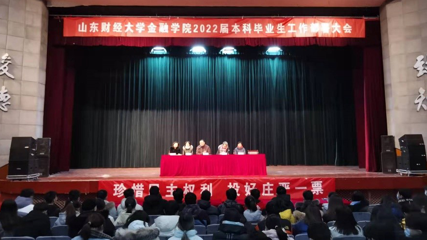 (通讯员:陈玉林)12月28日上午,金融学院在舜耕礼堂隆重召开2022届本科毕业生工作部署大会。学院党委书记吴红文、团委书记陈静、教学秘书李霞、就业办主任郭夕熙、辅导员陈玉林以及全体2022届本科毕业生参加了本次会议。会议由党委副书记范志毅主持。