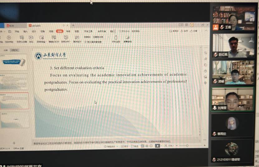 彭红枫院长就山东财经大学金融学院的研究生培养现状进行了分享,说明了学术型研究生和专业型研究生的区别,目前学院攻读博士的现状和学生培养存在的问题。提出了从课程开始提高研究生培养质量的建议,并指出目前学院实行的专业型硕士的双导师制在一定程度上缓解了学生实习和寻找工作的问题。并提出下一步要结合大家的建议进一步优化研究生培养方案。