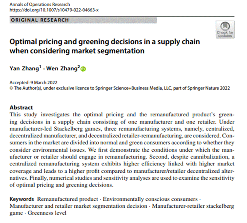 金融学院教师张艳作为第一作者发表的论文,“Optimal pricing and greening decisions in a supply chain when considering market segmentation”,在期刊 Annals of Operations Research 在线发表(2022年3月)。该期刊系运筹学与管理科学SCI三区期刊,最新影响因子为6.1,属我校A2类期刊。