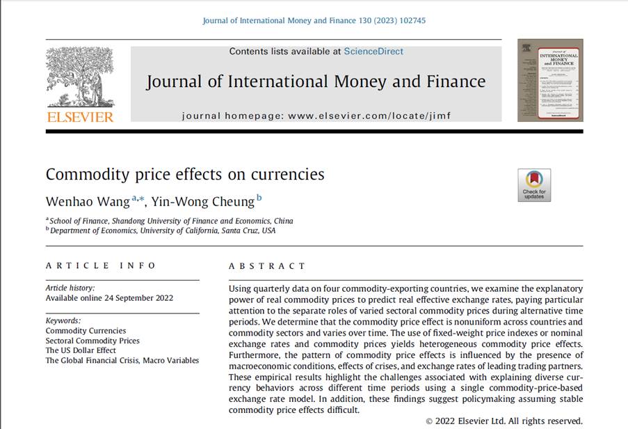 金融学院教师王文浩作为第一作者与加州大学圣克鲁兹分校教授Yin-Wong Cheung合作的论文“Commodity price effects on currencies”,在期刊Journal of International Money and Finance在线发表(2022年9月)。该期刊为SSCI二区期刊,期刊最新影响因子为2.762,属我校A1类期刊。
