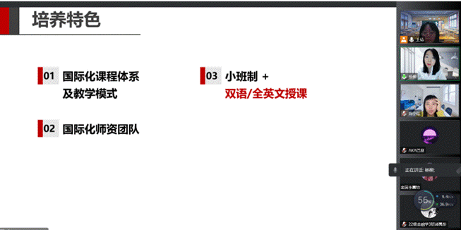 杨柳老师介绍了金融学国际化实验班的培养特色、目标、学分和课程设置、选拔条件和流程。杨柳指出,金融学院国际化实验班的培养特色为国际化课程体系及教学模式、小班制加双语或全英文授课、国际化师资团队、国际合作办学;培养目标为注重培养学生的知识、能力、素质,具备法治观念和诚信理念,掌握经济学和金融学专业的核心理论,胜任银行、证券、投资等行业的业务需要及科研机构的研究需要,具备创新创业能力和团队合作能力。此外,杨柳老师逐一详细解答了同学们关于金融学院国际化实验班的培养方案、双语课程学习方法、留学指导和雅思培训等方面的相关问题。