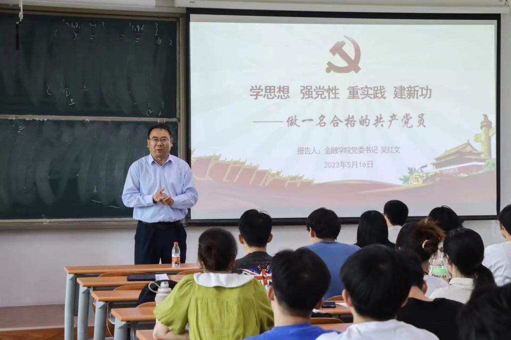 5月16日,金融学院党委书记吴红文在圣井校区做了题为“学思想,强党性,重实践,建新功”的主题教育党课。金融学院近百名党员发展对象现场聆听了党课。