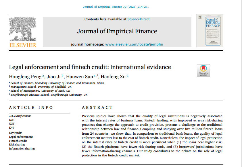 金融学院彭红枫教授作为第一作者与英国谢菲尔德大学Jiao Ji教授、英国巴斯大学的Hanwen Sun教授、英国拉夫堡大学Haofeng Xu教授合作的论文“Legal enforcement and fintech credit: International evidence”在期刊Journal of Empirical Finance正式发表(20233月)。该期刊为SSCI二区期刊,期刊最新影响因子为3.025,属我校A1类期刊。