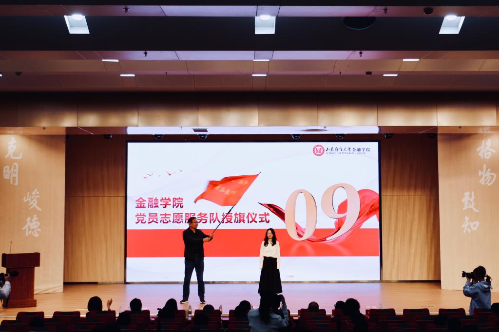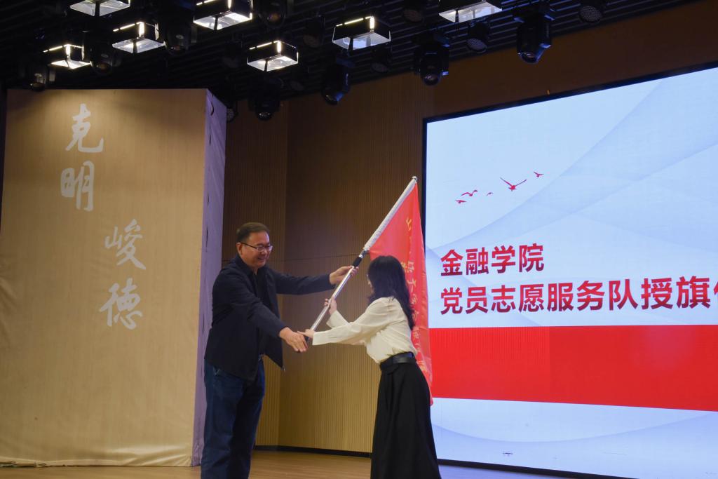 本次仪式由吴红文书记为金融学院党员志愿服务队授旗。伴随着慷慨激昂的《国际歌》,吴红文书记高举旗帜走上了主席台,将象征着为人民服务的重任的旗帜交给了学生党员志愿服务队代表李蕊宇。