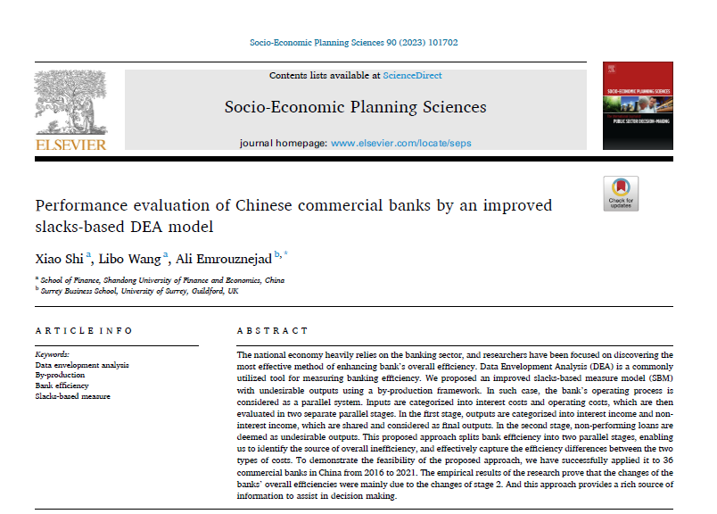 金融学院石晓副教授作为第一作者与硕士研究生王利波、英国萨里大学Ali Emrouznejad教授合作的论文“Performance evaluation of Chinese commercial banks by an improved slacks-based DEA model”在期刊Socio-Economic Planning Sciences正式发表(2023, Vol. 90, Issue: Dec)。该期刊为SSCI一区期刊,期刊最新影响因子为6.1,属我校A1类期刊。
