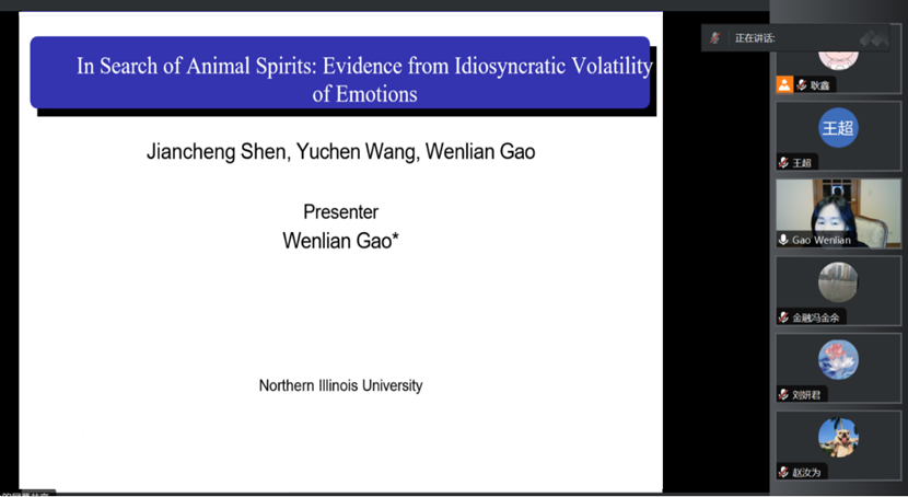 2023年12月15日上午,北伊利诺伊大学(Northern Illinois University)助理教授高文莲(Wenlian Gao)老师应邀做客山东财经大学金融学院泰山学术训练营并做了题为“In Search of Animal Spirits: Evidence From Idiosyncratic Volatility of Emotions”的学术报告。会议由金融学院副院长王营教授主持,金融学院部分教师和学生参加了此次会议。