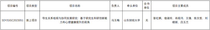 近日,山东省教育厅发布“关于公布2023年山东省研究生教育教学改革研究项目立项名单的通知”,我院冯玉梅教授主持的“导生关系检视与协同发展研究:基于研究生科研创新能力和心理健康提升的视角”获批研究生教育教学改革研究面上项目。