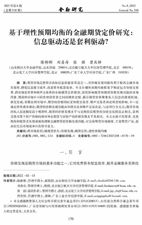 金融学院教师陈彬彬(第一作者)与北京航空航天大学刘善存教授、北京化工大学张强教授(通讯作者)和广东工业大学曾庆铎合作撰写的论文《基于理性预期均衡的金融期货定价研究:信息驱动还是套利驱动?》在《金融研究》2023年第8期发表。该期刊属于我校A1期刊。