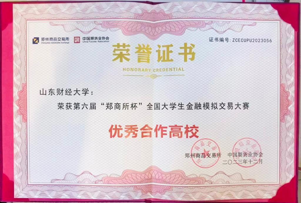 郑商所杯”全国大学生金融模拟交易大赛旨在为在校大学生提供理论知识应用的机会,推动期货投资者教育工作纳入国民教育体系,助力培养高素质青年人才,为期货市场培育具有模拟交易经验的复合型人才。金融学院学生张天烁、童奕哲、王雪获得鼓励奖,我校获评“优秀合作高校”。