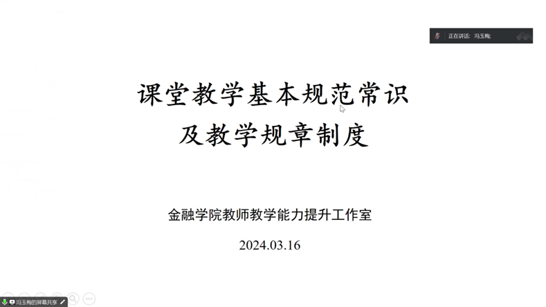 新学期伊始,为培养和提升新入职青年教师的教学能力,金融学院教师教学能力提升办公室于2024年3月16日举办了以《课堂教学基本规范常识及教学规章制度》为主题的线上座谈会。本次座谈会由我院教学、管理经验丰富的冯玉梅教授主讲,近两年新入职青年教师与会。