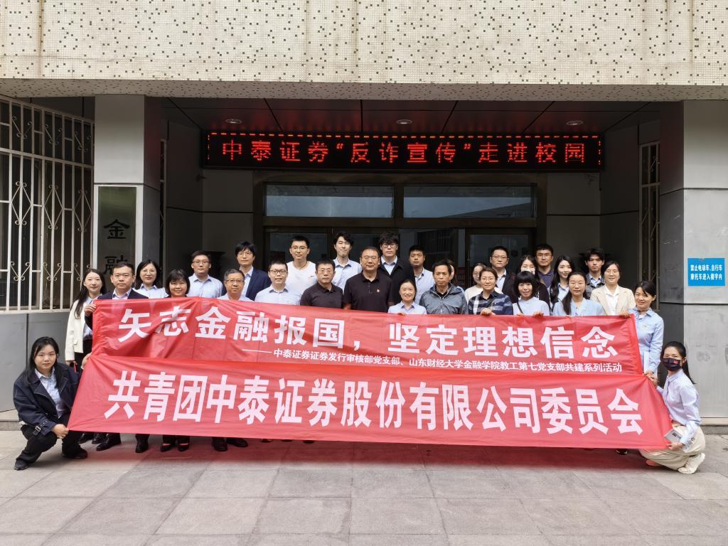 为深入贯彻落实党的二十大精神,坚定党员及青年职工听党话、跟党走的政治信念,弘扬中国特色金融文化,4月28日上午,山东财经大学金融学院教工第七党支部联合中泰证券证券发行审核部党支部、中泰证券团委、中泰证券合规管理总部党支部及中泰资本党支部,先后在山东财经大学舜耕校区、中泰证券投教基地开展“矢志金融报国,坚定理想信念”支部共建系列活动,喜迎第75个五四青年节。金融学院党委书记吴红文,党委副书记康亚通、李开传出席活动。