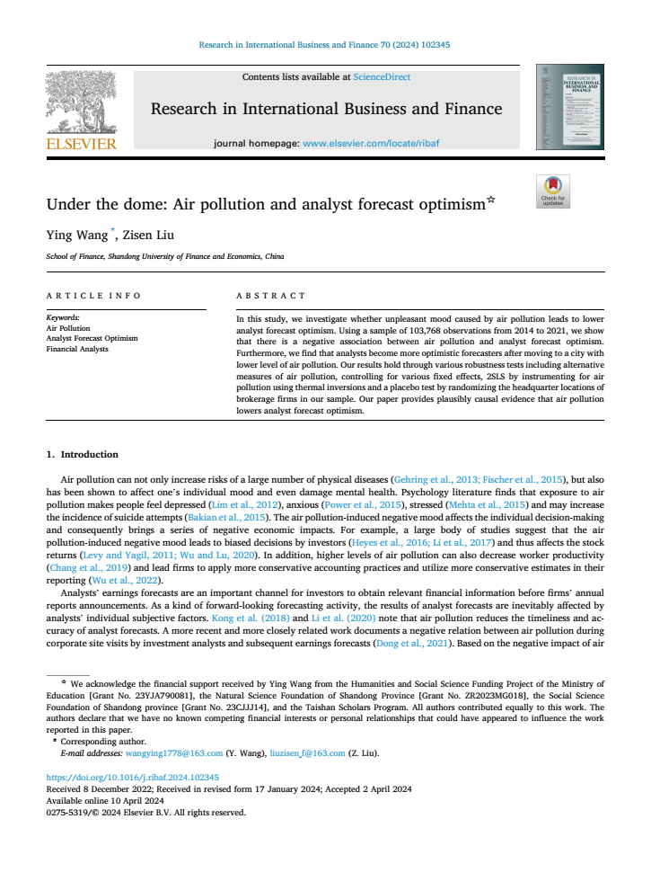 金融学院王营教授和研究生刘梓森同学合作的学术论文《Under the dome: Air pollution and analyst forecast optimism》在《Research in International Business and Finance》2024年第70卷Part A发表。该期刊系我校A1类期刊。