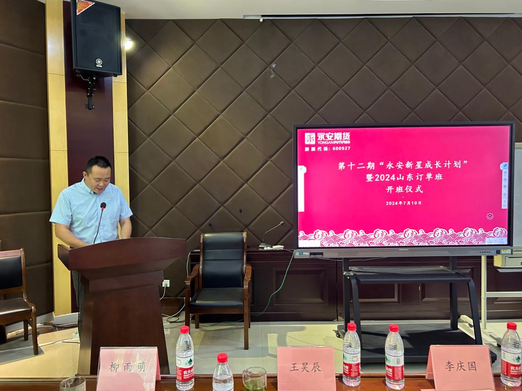 李庆国代表企业致辞,他介绍了永安期货的基本情况,对金融学院为学员们提供了良好的学习环境表示感谢。此次订单班旨在帮助同学们提前了解金融行业、积极拓展社交渠道,希望培养出全面发展的金融人才,为行业发展贡献力量。他鼓励学员们认真学习、广泛交流,并预祝此次订单班取得圆满成功。