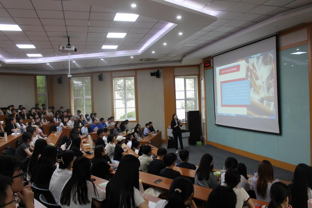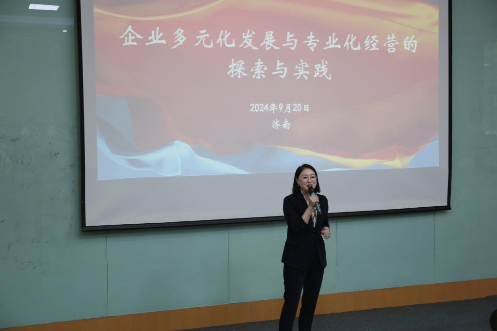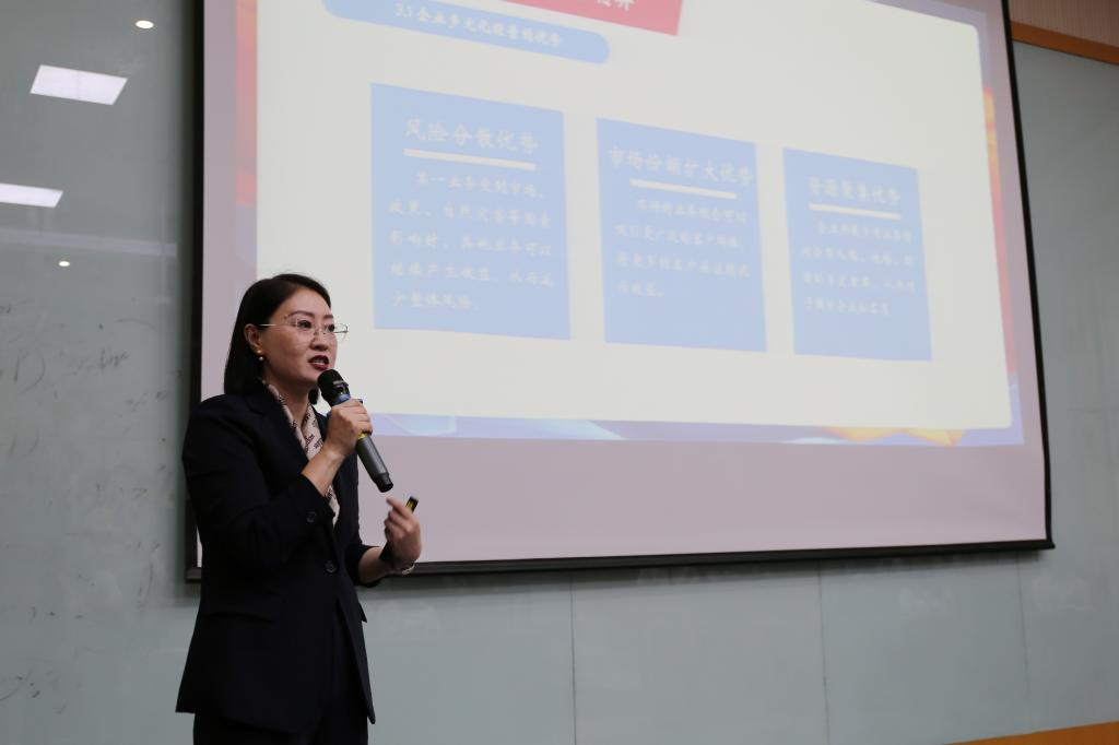 讲座上,李开传代表学院对校友商雪梅表示热烈欢迎。商雪梅表达了自己重返校园的亲切之情,感念母校的培养之恩。她从自身求职经历,向同学们分享了从职场小白的“蜕变”到多元化产业集团管理者的“蝶变”的奋斗历程,并从企业多元化发展战略和企业专业化经营策略两个方面为同学们开展报告。
